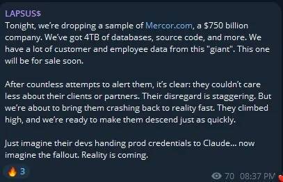 在Mercor3月31日确认泄露同日,另一个黑客组织Lapsus$宣称掌握4TB的Mercor数据,包括源代码、数据库记录和视频资料,并在暗网上公开叫卖。